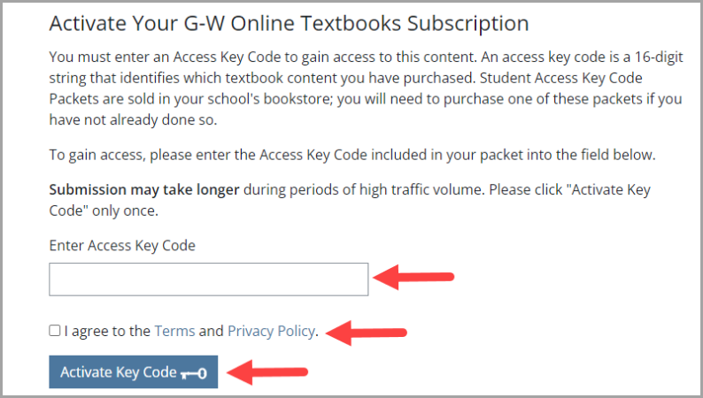 - On the next screen, you will be prompted to type in your access key code. Enter the Access Key Code, click on the checkbox to agree to the Terms and Privacy Policy and select Activate Key Code.